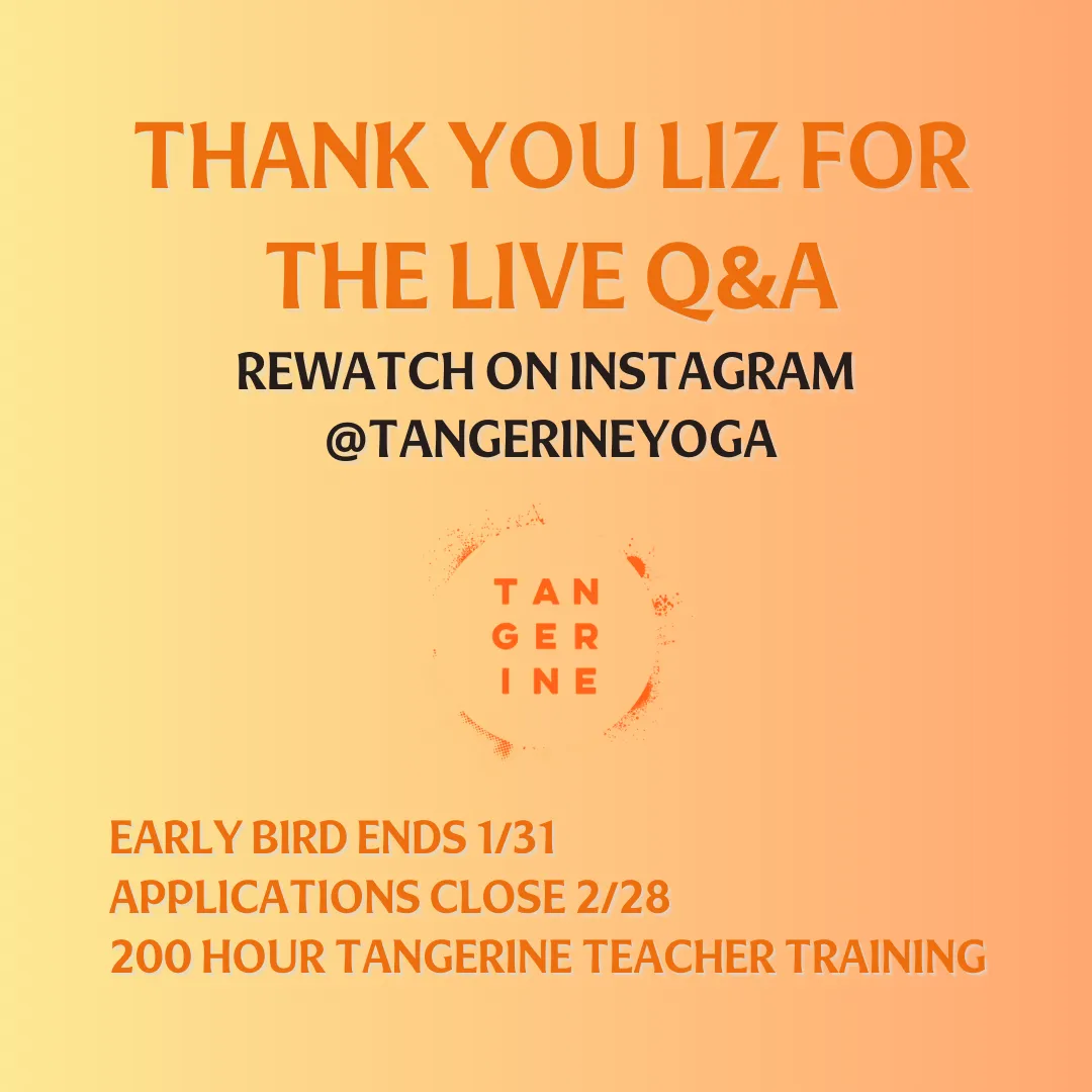 On Wednesday, we hosted an Instagram Live with Liz to answer your questions directly and give more clarity about our 200 Hour Teacher Training, starting this March. A recording of the Q&A is saved on our account @tangerineyoga for you to watch. More questions can be sent to hannah@tangerine.yoga and Liz said to DM them anytime.