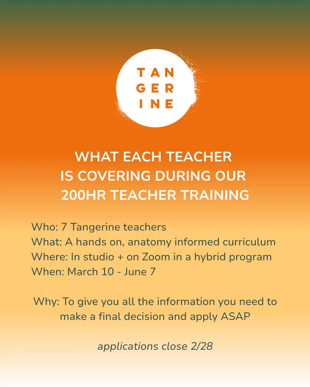 A big thank you to learning at Tangerine with our 200 Hour Teaching Program and continuing to invest your energies here at the studio. Brooke, Cissy, Indigo, Molly, and Sabrina, we appreciate all you do for this community.